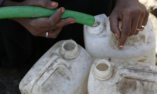 A woman collects water from a charity tap in Sanaa, Yemen, on Oct. 22, 2019. (Photo by Mohammed Mohammed/Xinhua)