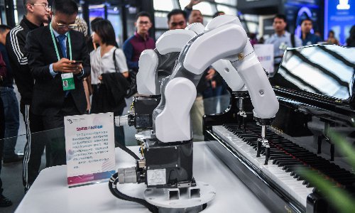 5G-based robots play the piano at the Light of Internet Expo in the river town of Wuzhen, East China's Zhejiang Province, on October 18, 2019. Photo: Xinhua