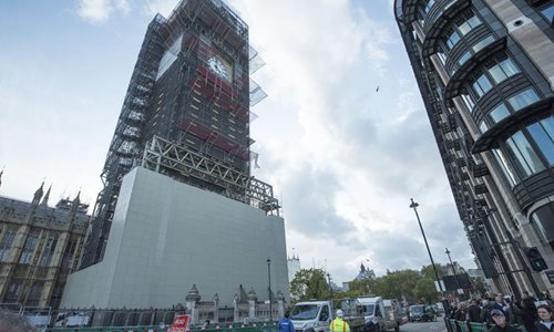 The surrounding roads are closed as an Extinction Rebellion protester demonstrates on the scaffolding surrounding the Elizabeth Tower, also known as the Big Ben, in London, Britain, on October 18. Photo: Xinhua