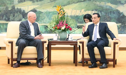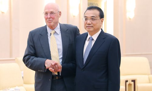 Chinese Premier Li Keqiang on Wednesday met with former US Treasury Secretary Henry Paulson in Beijing.