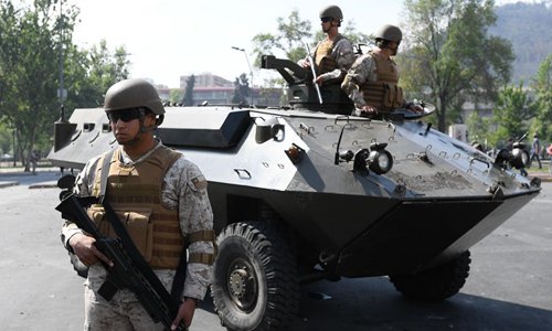 Soldiers stand guard on the street in Santiago, Chile, Oct. 19, 2019. (Xinhua/Jorge Villegas)