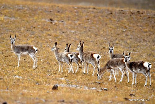 Tibetan antelopes are seen on a grassland in Shuanghu County of Nagqu, southwest China's Tibet Autonomous Region, Oct. 21, 2019. Shuanghu, the world's highest county with an average elevation of 5,000 meters, lies within the Qiangtang National Nature Reserve where many endangered wild animals live and breed. (Xinhua/Chogo)