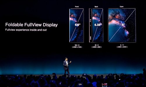 Richard Yu presents the Mate X, a foldable 5G ready smartphone, ahead of the Mobile World Congress in Barcelona, Spain on Feb. 24, 2019. The Mate X has a 6.6-inch screen, which can be opened out into an eight-inch OLED screen to allow the user to read or view videos. (Xinhua)
