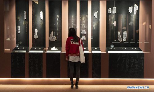 A visitor views exhibits at an exhibition to commemorate the 120th anniversary of oracle bone inscription discovery in National Museum of China of Beijing, capital of China, Oct. 22, 2019. An exhibition opened at the National Museum of China Tuesday to commemorate the 120th anniversary of oracle bone inscription discovery. Oracle bone inscriptions are important materials for studying the original configuration of Chinese characters. (Xinhua/Cai Yang)