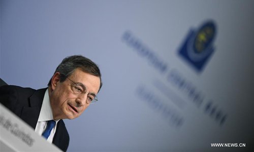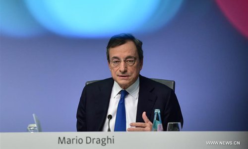 European Central Bank (ECB) President Mario Draghi speaks at a press conference at the ECB headquarters in Frankfurt, Germany, Oct. 24, 2019. The European Central Bank (ECB) on Thursday decided to keep the key interest rates for the euro area unchanged. The eurozone base interest rate will remain at 0.00 percent, with the marginal lending rate and deposit rate remaining at 0.25 percent and minus 0.50 percent respectively. (Xinhua/Lu Yang)