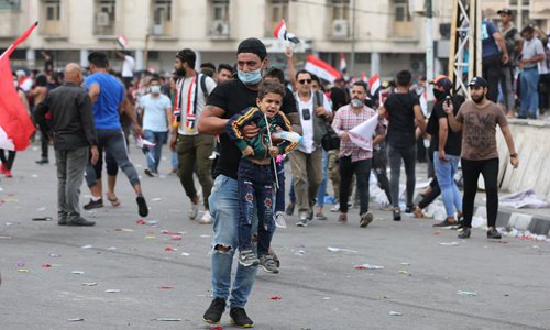 A protester carries a boy to safety during a protest at the Tahrir Square in Baghdad, Iraq, on Oct. 25, 2019. (Xinhua/Khalil Dawood)