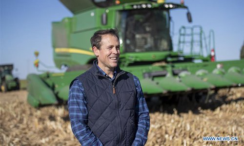 Grant Kimberley, director of market development at the Iowa Soybean Association, receives an interview at his family farm in Maxwell, the US state of Iowa, Oct. 17, 2019. (Xinhua/Wang Ying)