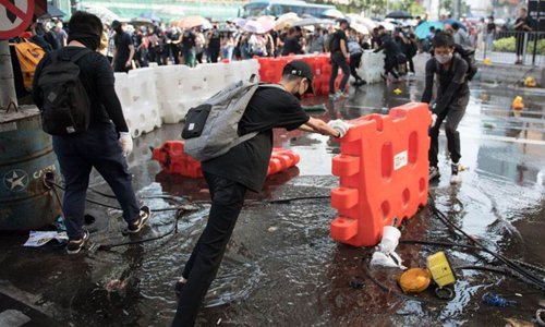 Black-clad men build road barricades in West Kowloon, south China's Hong Kong, on Oct. 20, 2019. (Xinhua)