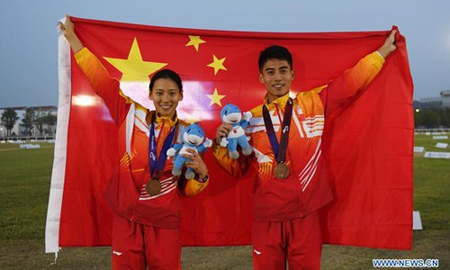 Bronze medalists Zhang Linbin (R) and Wang Wei of China celebrate after the awarding ceremony of the mixed relay of modern pentathlon at the 7th CISM Military World Games in Wuhan, capital of central China's Hubei Province, Oct. 26, 2019. (Xinhua/Li Ga)
