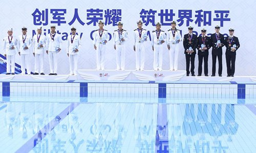 Gold medalists team China(C) , silver medalists team Brazil (L) and bronze medalists team Germany attend the awarding ceremony of the men's team of naval pentathlon at the 7th CISM Military World Games in Wuhan, capital of central China's Hubei Province, Oct. 26, 2019. (Xinhua/Chen Yehua)