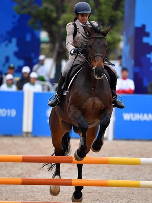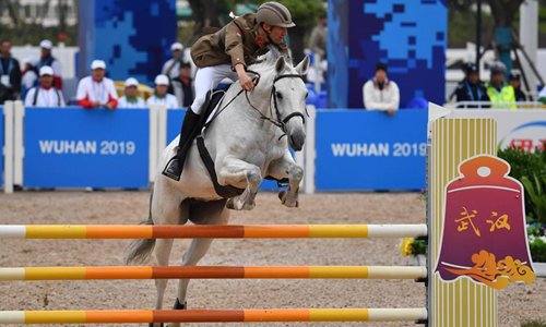 Abdelmaksoud Salma of Egypt competes during the riding of the mixed relay of modern pentathlon at the 7th CISM Military World Games in Wuhan, capital of central China's Hubei Province, Oct. 26, 2019. (Xinhua/Li Ga)
