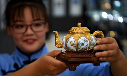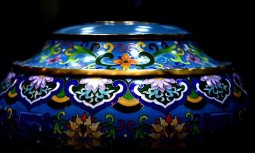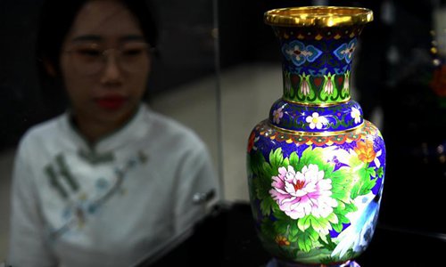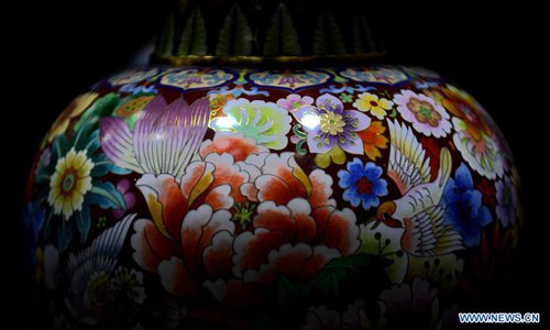 A cloisonne work is seen at an exhibition in Dachang Hui Autonomous County of north China's Hebei Province, Oct. 26, 2019. (Xinhua/Wang Xiao)