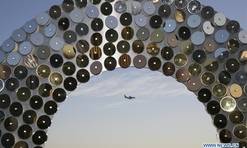 A plane flies past an exhibit of the Sculpture by the Sea exhibition at Bondi Beach in Sydney, Australia, on Oct. 26, 2019. The exhibition is open to the public from Oct. 24 to Nov. 10. (Xinhua/Bai Xuefei)