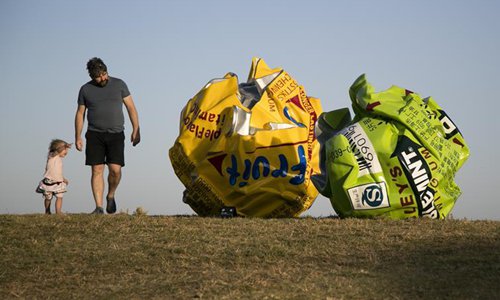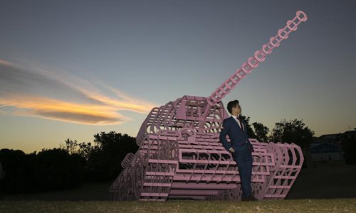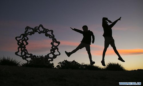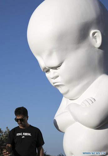 Visitors pose for pictures by an exhibit of the Sculpture by the Sea exhibition at Bondi Beach in Sydney, Australia, on Oct. 26, 2019. The exhibition is open to the public from Oct. 24 to Nov. 10. (Xinhua/Bai Xuefei)