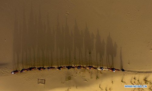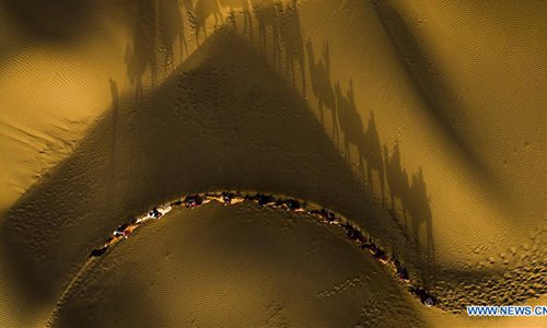 Aerial photo taken on Oct. 26, 2019 shows tourists riding camels to enjoy the desert scenery at Lop Nur People Village in Yuli County, northwest China's Xinjiang Uygur Autonomous Region. In the first three quarters of this year, Xinjiang received over 183.85 million tourists from home and abroad with a year-on-year increase of 40.9 percent, and saw a total tourism revenue of more than 304.6 billion yuan (about 43.1 billion U.S. dollars) with a year-on-year growth of 40.78 percent. (Photo: Xinhua)