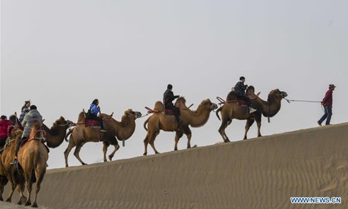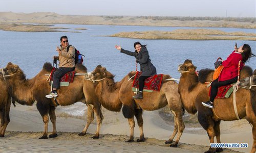 Tourists ride camels to enjoy the desert scenery at Lop Nur People Village in Yuli County, northwest China's Xinjiang Uygur Autonomous Region, Oct. 26, 2019. In the first three quarters of this year, Xinjiang received over 183.85 million tourists from home and abroad with a year-on-year increase of 40.9 percent, and saw a total tourism revenue of more than 304.6 billion yuan (about 43.1 billion U.S. dollars) with a year-on-year growth of 40.78 percent.(Photo: Xinhua)
