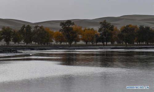 Photo taken on Oct. 26, 2019 shows the scenery of the populus euphratica, commonly known as desert poplar, along the Tarim River in northwest China's Xinjiang Uygur Autonomous Region. In the first three quarters of this year, Xinjiang received over 183.85 million tourists from home and abroad with a year-on-year increase of 40.9 percent, and saw a total tourism revenue of more than 304.6 billion yuan (about 43.1 billion U.S. dollars) with a year-on-year growth of 40.78 percent. (Photo: Xinhua)