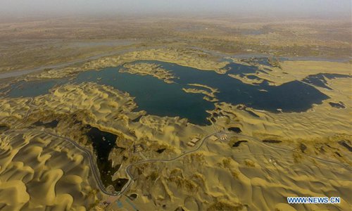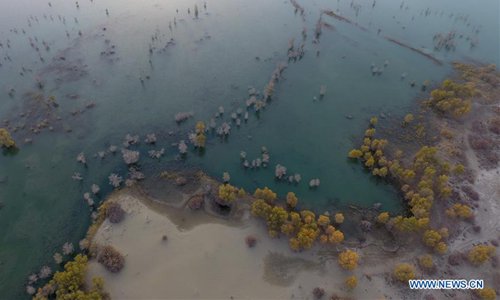 Aerial photo taken on Oct. 26, 2019 shows the scenery of Shennyu Lake scenic spot at Lop Nur People Village in Yuli County, northwest China's Xinjiang Uygur Autonomous Region. In the first three quarters of this year, Xinjiang received over 183.85 million tourists from home and abroad with a year-on-year increase of 40.9 percent, and saw a total tourism revenue of more than 304.6 billion yuan (about 43.1 billion U.S. dollars) with a year-on-year growth of 40.78 percent. (Photo: Xinhua)