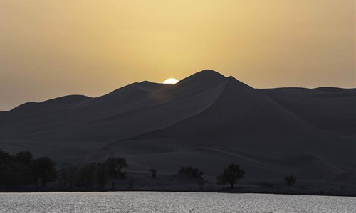 Photo taken on Oct. 25, 2019 shows the sunset scenery of Lop Nur in Yuli County, northwest China's Xinjiang Uygur Autonomous Region. In the first three quarters of this year, Xinjiang received over 183.85 million tourists from home and abroad with a year-on-year increase of 40.9 percent, and saw a total tourism revenue of more than 304.6 billion yuan (about 43.1 billion U.S. dollars) with a year-on-year growth of 40.78 percent.(Photo: Xinhua)