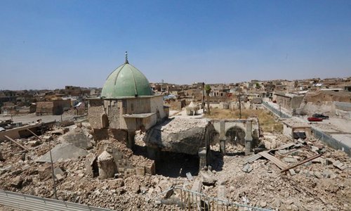 Photo taken on July 14, 2019 shows the destroyed al-Nuri Mosque in the old city of Mosul, Iraq. The war for liberating Iraq's Mosul from the Islamic State (IS) militant group has achieved victory for two years, but its grave impacts still weigh heavily on the city's residents.(Photo: Xinhua)