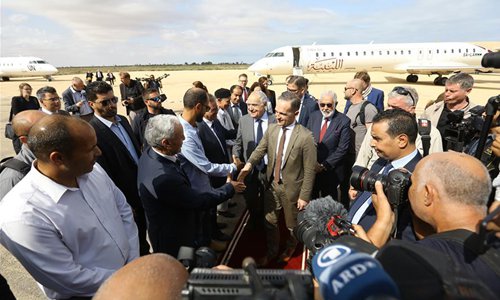 United Nations Special Envoy to Libya Ghassan Salame and German Foreign Minister Heiko Maas are welcomed upon arrival in Zuwara, Libya, Oct. 27, 2019. German Foreign Minister Heiko Maas on Sunday stressed Germany's support for the efforts of the UN Special Envoy to Libya Ghassan Salame that aim to end the current Libyan crisis. Photo: Xinhua