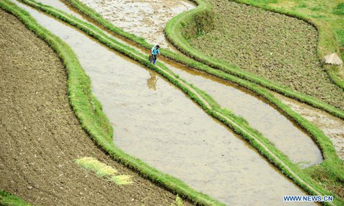 A farmer carries fertilizer at Dongzhuang Village of Guben Town in Jinping County, southwest China's Guizhou Province, April 6, 2018. Photo: Xinhua