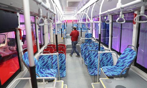 Photo taken on Oct. 29, 2019 shows the interior of a Foton electric bus in Salam City, east of Cairo, capital of Egypt. Egypt's Ministry of Military Production and China's vehicle manufacturer Foton Motor celebrated on Tuesday the launch of a new project for jointly manufacturing electric buses in Egypt. During a ceremony in Salam City, both sides also celebrated the delivery of Foton's first batch of two electric buses for Egypt. (Xinhua/Ahmed Gomaa)