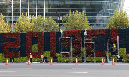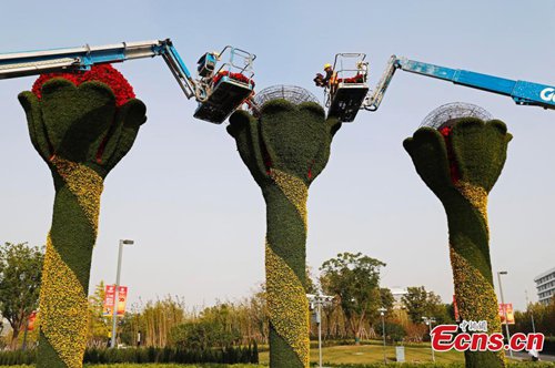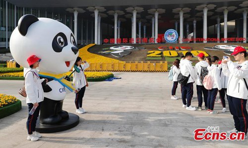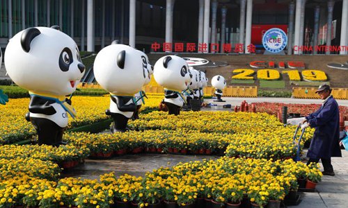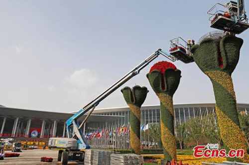 Preparation work is underway near the National Exhibition and Convention Center in Shanghai, the venue for the second China International Import Expo (CIIE), Oct. 29, 2019. The expo is scheduled to run from Nov. 5 to 10 and will have an exhibition area of 360,000 square meters, 60,000 square meters larger than that of last year’s event. (Photo: China News Service/Yin Liqin)