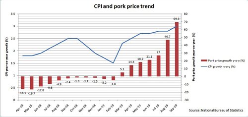 The importance of pork, the primary protein source on the Chinese table, has become especially noteworthy this year. Pork prices soared 27 percent, 46.7 percent, and 69.3 percent year-on-year in July, August, and September, respectively, pushing China's consumer price index (CPI) to relatively high levels of 2.8 percent, 2.8 percent, and 3 percent in the corresponding months, according to data from the National Bureau of Statistics.