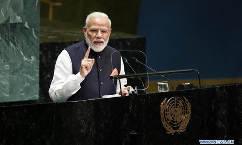 Indian Prime Minister Narendra Modi addresses the General Debate of the 74th session of the UN General Assembly at the UN headquarters in New York, on Sept. 27, 2019. (Xinhua/Li Muzi)