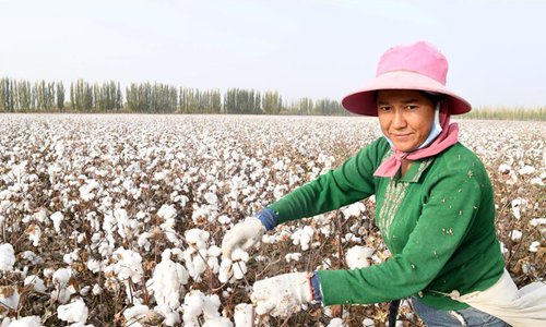 A woman works in a cotton field in Awat County, northwest China's Xinjiang Uygur Autonomous Region, Oct. 25, 2019. With a long history of cotton planting, Awat is known as the "Town of Cotton" in China. The county boasts high-quality cotton and high-efficiency in production. (Xinhua/Sadat)
