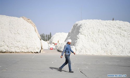 A worker walks in a cotton factory in Awat County, northwest China's Xinjiang Uygur Autonomous Region, Oct. 27, 2019. With a long history of cotton planting, Awat is known as the "Town of Cotton" in China. The county boasts high-quality cotton and high-efficiency in production. (Xinhua/Sadat)