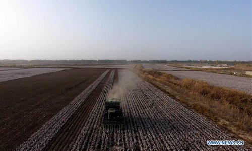Photo taken on Oct.25, 2019 shows a cotton field in Awat County, northwest China's Xinjiang Uygur Autonomous Region. With a long history of cotton planting, Awat is known as the "Town of Cotton" in China. The county boasts high-quality cotton and high-efficiency in production. (Xinhua/Sadat)