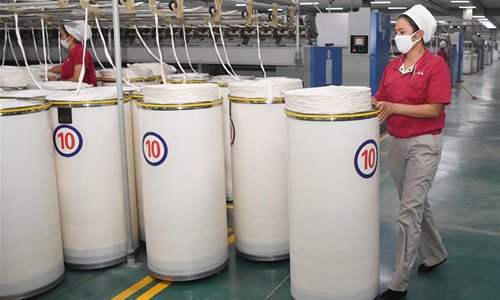 People work in a cotton mill in Awat County, northwest China's Xinjiang Uygur Autonomous Region, Oct. 27, 2019. With a long history of cotton planting, Awat is known as the "Town of Cotton" in China. The county boasts high-quality cotton and high-efficiency in production. (Xinhua/Sadat)