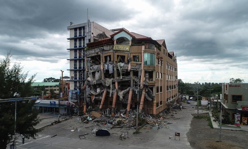 A general view shows a damaged building after a 6.5-magnitude earthquake hit Kidapawan town, north Cotabato province, on the southern island of Mindanao, the Philippines on Thursday. A powerful earthquake struck the southern Philippines on Thursday, crushing a man under falling debris and sparking searches of seriously damaged buildings that had already been rattled by two previous deadly tremors. Photo: AFP