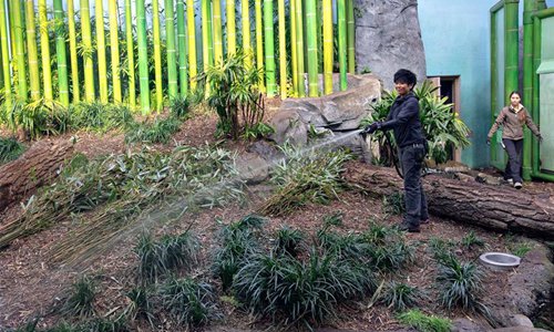 A zookeeper cleans panda stall in the Calgary Zoo, Canada, Oct. 30, 2019. Panda cubs Jia Panpan and Jia Yueyue in Canada's Calgary Zoo will be moving to the Giant Panda Research Base in Chengdu, capital of China's southwestern Sichuan Province, in early 2020, according to the Calgary Zoo. Jia Panpan, a male, and Jia Yueyue, a female, came to Calgary city in March 2018, and they are now almost 4 years old. The panda twins are leaving Calgary as the term of their loan agreement between Canada and China has come to an end. (Photo by Andrew Soong/Xinhua)