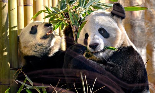 Panda cubs Jia Panpan and Jia Yueyue eat bamboo leaves in the Calgary Zoo, Canada, Oct. 30, 2019. Panda cubs Jia Panpan and Jia Yueyue in Canada's Calgary Zoo will be moving to the Giant Panda Research Base in Chengdu, capital of China's southwestern Sichuan Province, in early 2020, according to the Calgary Zoo. Jia Panpan, a male, and Jia Yueyue, a female, came to Calgary city in March 2018, and they are now almost 4 years old. The panda twins are leaving Calgary as the term of their loan agreement between Canada and China has come to an end. (Photo by Andrew Soong/Xinhua)