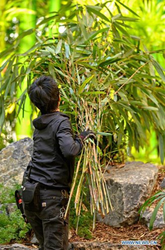 A zookeeper provides fresh bamboo to panda stall in the Calgary Zoo, Canada, Oct. 30, 2019. Panda cubs Jia Panpan and Jia Yueyue in Canada's Calgary Zoo will be moving to the Giant Panda Research Base in Chengdu, capital of China's southwestern Sichuan Province, in early 2020, according to the Calgary Zoo. Jia Panpan, a male, and Jia Yueyue, a female, came to Calgary city in March 2018, and they are now almost 4 years old. The panda twins are leaving Calgary as the term of their loan agreement between Canada and China has come to an end. (Photo by Andrew Soong/Xinhua)