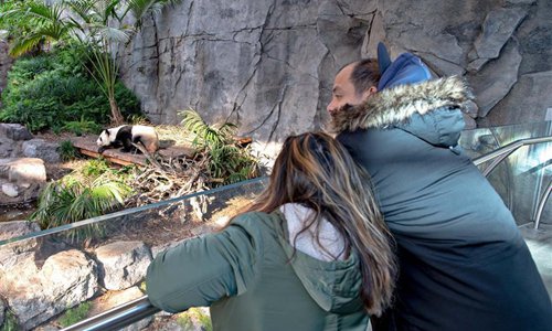 Visitors view a panda at the Calgary Zoo, Canada, Oct. 30, 2019. Panda cubs Jia Panpan and Jia Yueyue in Canada's Calgary Zoo will be moving to the Giant Panda Research Base in Chengdu, capital of China's southwestern Sichuan Province, in early 2020, according to the Calgary Zoo. Jia Panpan, a male, and Jia Yueyue, a female, came to Calgary city in March 2018, and they are now almost 4 years old. The panda twins are leaving Calgary as the term of their loan agreement between Canada and China has come to an end. (Photo by Andrew Soong/Xinhua)