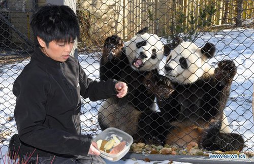 A keeper feeds panda cubs Jia Panpan and Jia Yueyue in the Calgary Zoo, Canada, Oct. 30, 2019. Panda cubs Jia Panpan and Jia Yueyue in Canada's Calgary Zoo will be moving to the Giant Panda Research Base in Chengdu, capital of China's southwestern Sichuan Province, in early 2020, according to the Calgary Zoo. Jia Panpan, a male, and Jia Yueyue, a female, came to Calgary city in March 2018, and they are now almost 4 years old. The panda twins are leaving Calgary as the term of their loan agreement between Canada and China has come to an end. (Photo by Andrew Soong/Xinhua)