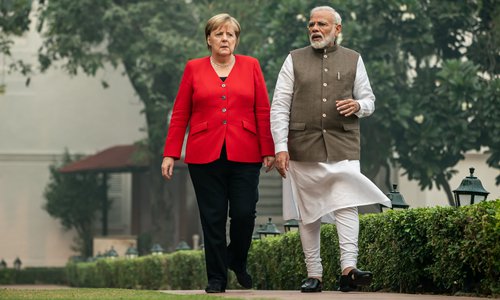 Chancellor Angela Merkel walks alongside Narendra Modi, Prime Minister of India. Photo: IC