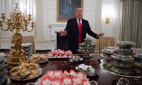 US President Donald Trump speaks in front of fast food he purchased for a ceremony honoring the 2018 College Football Playoff National Champion Clemson Tigers, in the State Dining Room of the White House in Washington, DC. Photo: AFP