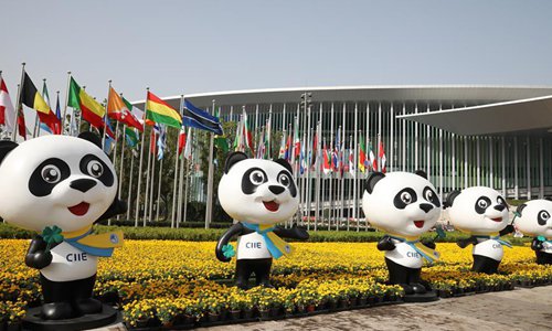 A line of mascots Jinbao" of China International Import Expo (CIIE) are placed at the National Exhibition and Convention Center (Shanghai), the venue of the second China International Import Expo, in Shanghai, east China, Oct. 30, 2019. (Xinhua/Fang Zhe)