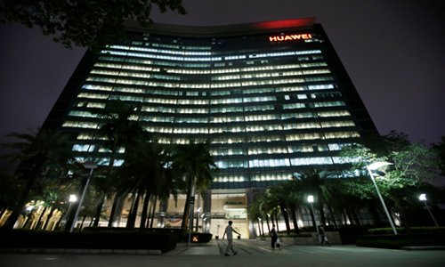 Employees walk past a research and development building with lights on at 22:04 pm in Huawei's headquarters in Shenzhen, South China's Guangdong Province in May. Photo: VCG