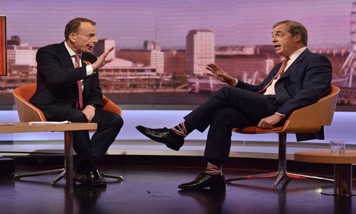 Britain's Brexit Party leader Nigel Farage (right) is interviewed on the BBC political program The Andrew Marr Show. Brexit figurehead Farage will not stand in Britain's upcoming general election, in which his party is threatening to go head-to-head with Prime Minister Boris Johnson's Conservatives, he announced on Sunday. Photo: AFP