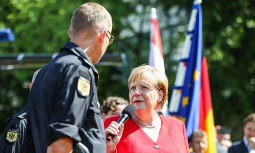 German Chancellor Angela Merkel (R) talks with a policeman during the German Federal Government Open Day in Berlin, Germany, on Aug. 18, 2019. (Xinhua/Shan Yuqi)