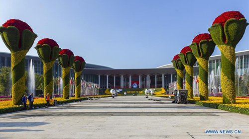 Photo taken on Nov. 3, 2019 shows flower parterres at the south plaza of the National Exhibition and Convention Center (Shanghai) where the second China International Import Expo (CIIE) is going to be held, in Shanghai, east China. The second CIIE will be held from Nov. 5 to 10 in Shanghai.(Photo: Xinhua)