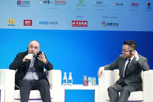 Italian director Giuseppe Tornatore (Left) and Monster Hunt director Raman Hui attend the Sino-Foreign Film Co-production Forum in Beijing on Sunday. Photo: Li Hao/GT