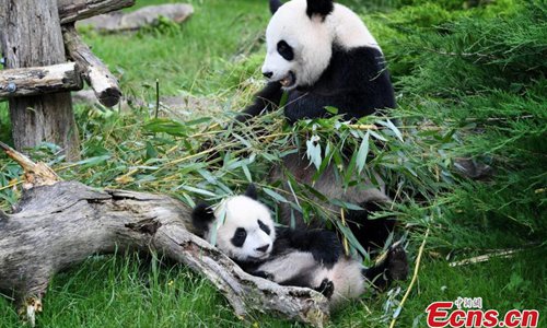 Photo taken on June 12, 2018 shows giant pandas Huan Huan and its cub Yuan Meng play at the Beauval Zoo in Saint-Aignan, France, June 12, 2018. The parents of Yuan Meng, Huan Huan and Yuan Zi, arrived in France in January 2012 on a 10-year loan from China. The name "Yuan Meng" means "the realization of a dream" in Chinese, and it's the first giant panda cub born in France. Photo: IC