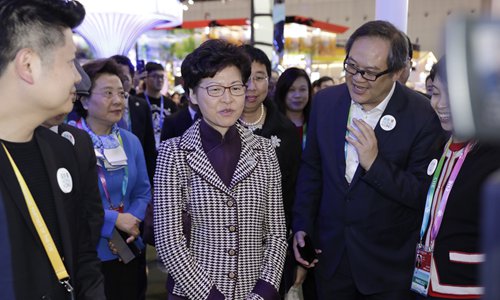 Hong Kong SAR Chief Executive Carrie Lam visits the Hong Kong exhibition area at the second China International Import Expo in Shanghai on Tuesday. Photo: AFP